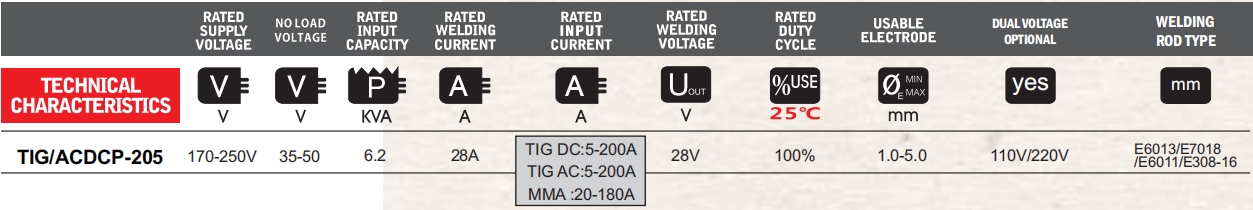 ●The TIGMAX-205 Series is an inverter based full bridge micro-process control portable welding machine. ●This welding machine is power source for arc welding,made specifically for TIG DC welding with Pulse or High Frequency or Lift TIG and MMA welding with coated electrodes. ●With Digital MCU control system for presision setting and DC PULSE, it will bring you a unique welding experience .It's Simple and easy to use for both beginner welders and experienced welders. ●The intuitive control panel consists of icon-based buttons and a digital display showing amperage,voltage or secondary parameters.It allows to easily select and adjust the desired parameters. ●High-frequency or LIFT ignition,which allows to weld near sensitive electronic devices. ●The pulse function provides better control of the weld pool.This applies in particular when used for position welding or sheet metal welding. ●AC/DC control panel allows to weld aluminum.